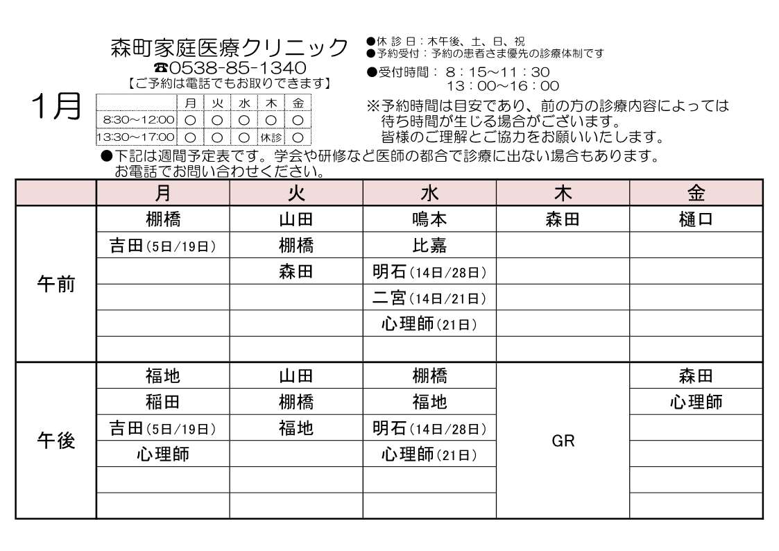 森町家庭医療クリニック診療体制< 予約制 >